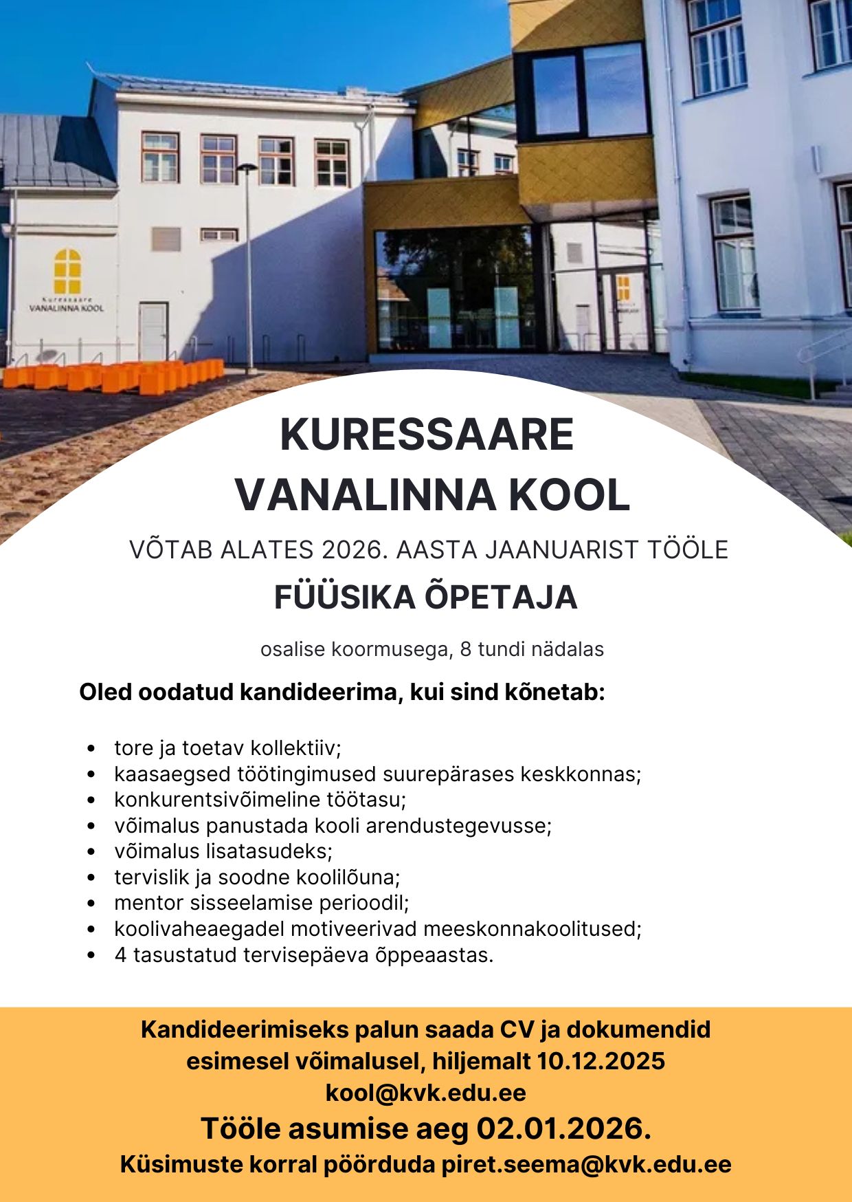Kandideerimiseks palun saata CV ja dokumendid esimesel võimalusel, hiljemalt 10.12.2025 kool@kvk.edu.eelink opens on new page